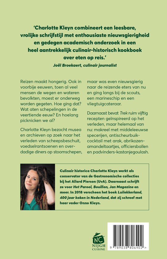 Voor de lezers die Charlotte Kleyn nog niet kennen is hier een korte intro. Charlotte is van beroep Culinair Historica. Ze schreef met haar vader Onno Kleyn het boek Luilekkerland*, 400 jaar koken in Nederland, dat in 2018 verscheen. Ze combineert haar baan als conservator van de Gastronomische collecties bij het Allard Pierson (UvA) met culinaire teksten/recepten in kranten en magazines. Tevens publiceerde ze onlangs haar eerste soloboek TREK, met als onthullende ondertitel Eten onderweg - Toen en Nu. Dat ze hiervoor behoorlijk wat research heeft gedaan spat van de pagina's af. Ze deed o.a. veldwerk bij de scouts, op een marineschip en bij een vliegtuigcateraar. Haar nieuwsgierigheid naar het eten van vroeger en nu bracht haar in musea en archieven, en ze deed een beroep op experts in verschillende relevante disciplines.