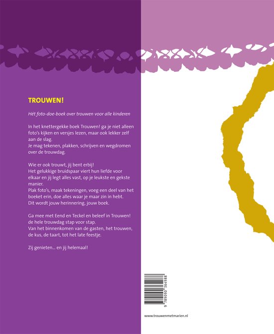 Trouwen! Hét foto-doe-boek over trouwen voor alle kinderen. Geschreven door Mireille Geus en geïllustreerd door Heleen Wilkens Naar idee van en in samenwerking met Marien Kuipers en uitgegeven door Trouwen met Marien.