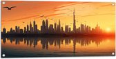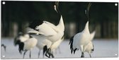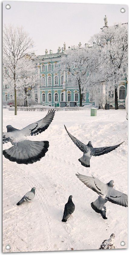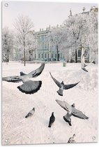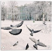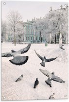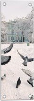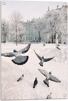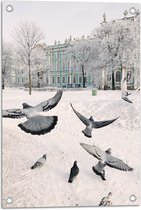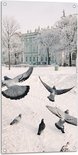 Tuinposter – Groepje Duiven Vliegend door Besneeuwde Stad - 50x100 cm Foto op Tuinposter (wanddecoratie voor buiten en binnen)