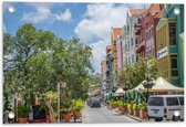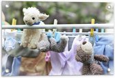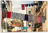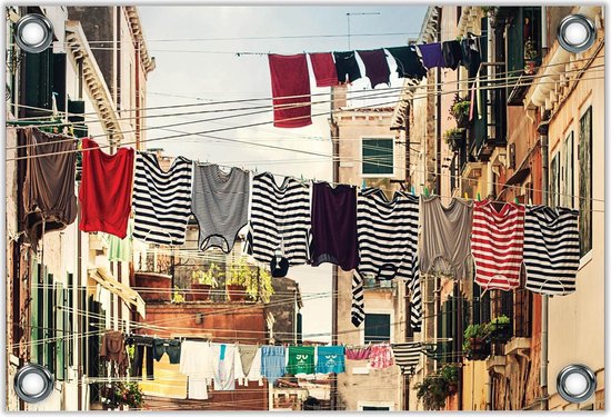 Tuinposter –Kleren aan de Waslijn in Straat– 60x40 Foto op Tuinposter (wanddecoratie voor buiten en binnen)