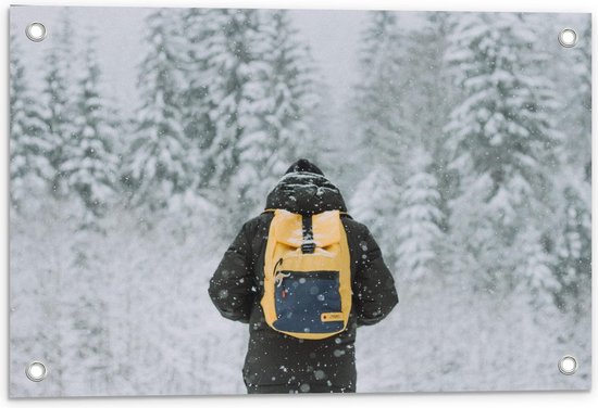Tuinposter – Man met Gele Rugzak in de Sneeuw - 60x40cm Foto op Tuinposter (wanddecoratie voor buiten en binnen)