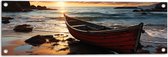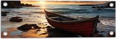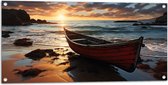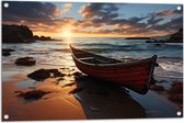 Tuinposter – Zand - Boot - Zonsondergang - Zee - Golven - Rotsen - 80x60 cm Foto op Tuinposter (wanddecoratie voor buiten en binnen)
