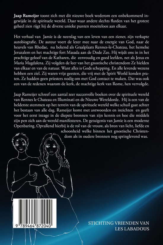 Jaap Rameijer toont zich met dit nieuwe boek wederom een onbekommerd ingewijde in de spirituele wereld. Daar waar andere slechts flarden van het grotere geheel zien rijgt hij de diverse unieke punten moeiteloos aan elkaar. Het verhaal van Jamie is de neerslag van een leven van een ziener, zijn verkapte autobiografie. De auteur voert de lezer mee naar de energie van God, naar de heuvels van Rhedae, nu bekend als Graalplaats Rennes-le-Chateau, het hemelse Jeruzalem en het machtige fort Masada aan de Dode Zee. Hij wijdt ons in in het prachtige geloof van de Katharen, die eenvoudig en goed leefden, net als Jezus en Maria Magdalena. Zij volgden de leer van het gnostische christendom Ze hielden van elkaar en van de natuur. Want alles is Gods schepping. En alle levende wezens hebben een ziel. Zij waren vrije geesten, die vrij met de Spirit World konden praten. Ze hadden geen priesters nodig om met God contact te maken. Dat was ook een van de redenen waarom de kerk, de machtige kerk van Rome, hen vervolgde. Jaap Rameijer schreef een aantal zeer succesvolle boeken over de spirituele wereld van Rennes le Chateau en Illuminati en de Nieuwe Wereldorde. Hij is een van de helderste stemmen op het terrein van de spirituele wereld welke schuil gaat achter het bestaan van alle dag. Rameijer komt met antwoorden en inzichten en geeft voor het eerst inzage in de diepste bronnen van zijn kennis en hoe die middels zijn pen zich aan de wereld manifesteren. De getuigenis van Jamie is een moderne Openbaring. Opvallend hierbij is de rol van de vrouw, als bron van licht, liefde en schoonheid welke binnen het gnostische Christendom als in oudere bronnen nog springlevend was.