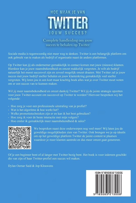 Op Twitter kan jij als ondernemer gemakkelijk in contact komen met jouw (nieuwe) klanten. Hierdoor kan je jouw naamsbekendheid en omzet makkelijk vergroten. Je wilt als bedrijf natuurlijk het meest succesvol zijn en zoveel mogelijk omzet draaien. Met Twitter zal je jouw succes met jouw bedrijf sneller behalen en jouw klantenkring gemakkelijk veel sneller vergroten. Wij leren jou in een kort maar krachtig boek alles wat je over Twitter moet weten om er een succes van te kunnen maken.
