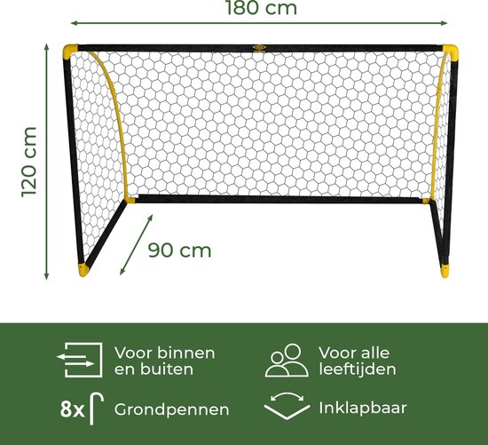 Oefen op jouw voetbal en keeper skills of daag je vrienden uit voor een potje voetbal met deze grote opvouwbare voetbalgoal van Umbro. Het fijne aan dit voetbaldoel is dat je hem na montage volledig op kunt vouwen. Dit betekent dat je hem slechts een keer in elkaar hoeft te zetten, en daarna door middel van opvouwen op kunt bergen. Met zijn afmetingen van 180 x 91 x 120 centimeter is dit het perfecte doel voor het oefenen van je keeper skills en doeltrappen. Om ervoor te zorgen dat het voetbaldoel niet zomaar omvalt tijdens de voetbal training kun je hem aan de grond verankeren met de 8 bijgeleverde metalen haken.