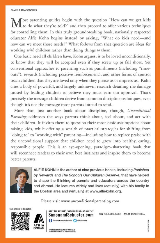 More than just another book about discipline, though, Unconditional Parenting addresses the ways parents think about, feel about, and act with their children. It invites them to question their most basic assumptions about raising kids while offering a wealth of practical strategies for shifting from “doing to” to “working with” parenting—including how to replace praise with the unconditional support that children need to grow into healthy, caring, responsible people. This is an eye-opening, paradigm-shattering book that will reconnect readers to their own best instincts and inspire them to become better parents.