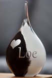 Urnen met naam en/of symbool, deze druppel mini urn (14 cm hoog, 7 cm breed) is een op maat gemaakte urn en gedenkbeeld van uw dierbare. De urn is handgemaakt en is van zuiver kristalglas. Door middel van belettering met metallic sign-folie van uw gewenste naam en afbeelding wordt uw urn geheel gepersonaliseerd. De belettering geeft een zeer goede hechting die niet los zal gaan! Deze hoge kwaliteit sign-folie wordt namelijk ook gebruikt voor het personaliseren van voertuigen als reclame uiting.
