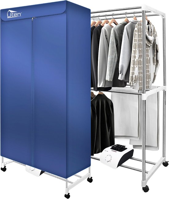 Uten Draagbare elektrische droger Gr886 - 2 lagen droog Design - Warmtepompdroger - 1500 W - Timer 0-180 Min - Elektrisch Droogrek met Verwarming - Wasdroger - Tot 15kg wasgoed - Als wasdroger, droogrek en Kledingkast- Hoogte 1.5 M - Blauw