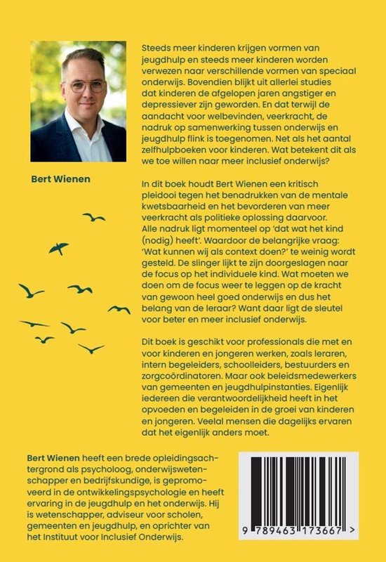 Een van de weinige schrijfsels die het bredere plaatje durft bloot te leggen. Weliswaar op NL model geschoeid maar inhoudelijk overal toepasselijk. De over-psychologisering en therapeutisering van opgroeiende kinderen zonder kennis van hun context en de gehele verantwoordelijkheid dan maar bij het onderwijs leggen maak ik beroepshalve dagelijks mee! De inzichten uit dit boek zijn eigenlijk volkomen logisch en van alle tijden maar men heeft meestal geen ruggengraat genoeg om dieper te zoeken naar die onderwijsaspecten die het kind écht vooruit helpen, behalve eerst en vooral het onderwijs helemaal terugplooien waarbij heel vaak ook té veel of zelfs helemààl de grillen van ouders of zorgprofessionals ongenuanceerd gevolgd worden. Uit eigen praktijk maak ik mee dat artsen, psychologen, coaches zelfs voorschrijven welke VAKKEN een leerling al dan niet mag volgen ... (!) zonder dat ze 1) onderwijskundige bevoegdheden hebben en 2) nog maar een begin van weet hebben over HOE onderwijs georganiseerd wordt. Bedankt Bert Wienen voor dit sterke, inspirerende en motiverende boek!
