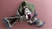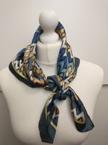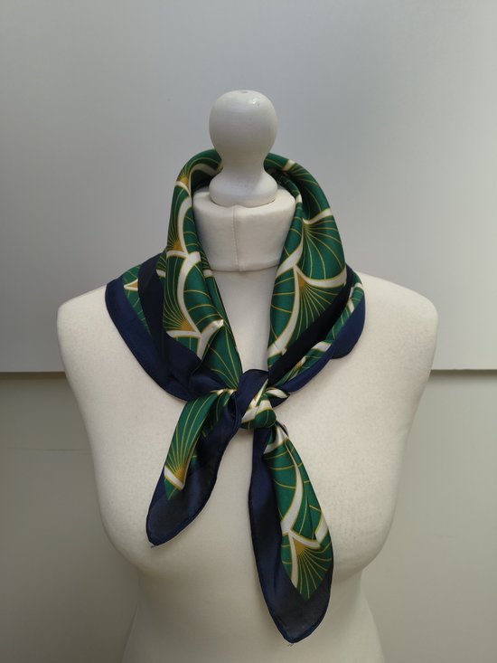 Vierkante dames neksjaal Eliane in fantasiemotief waaierpatroon in de kleuren groen, wit, zwart en rotan goud. Vierkant model. De sjaal is gemaakt van 100% polyester. U kunt neksjaal Eliane wassen op 30 graden. Een leuke halssjaal of sjaal om te gebruiken als versiering aan uw tas. U kunt de sjaal dragen op een T-shirt, blouse, trui, tuniek, jurk, blazer of jasje. De lengte van de sjaal is 70 cm, de breedte van de sjaal is 70 cm.