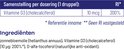 - Dosering en gebruik Neem 2 druppels per dag. De aanbevolen dosering niet overschrijden. Lees voor het gebruik het etiket van deze verpakking voor de voorzorgsmaatregelen en/of gevarenaanduidingen bij dit product. Samenstelling Samenstelling per 2 druppelsVitamine D3 (cholecalciferol) 10 mcg 200% RI% RI is percentage van de Referentie Inname Ingrediënten Zonnebloemolie (draagstof), Vitamine D3 (cholecalceferol) (10 µg: 200%*), D-alfa-tocoferol (natuurlijke anti-oxidant). Bevat geen:GMO, gluten, gist, lactose, suiker, kunstmatige kleurstoffen, smaakstoffen of conserveringsmiddelen.