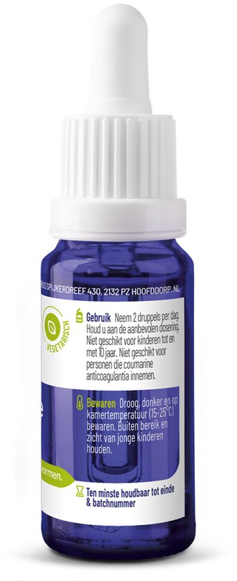De combinatie van Vitamine D en vitamine KVitamine D bevordert de absorptie van calcium*. Dit kan echter een problematisch effect geven wanneer vitamine D suppletie in hoge dosering (vanaf 75 mcg) nodig is om een bepaald gezondheid bevorderend effect te bereiken. De zonnevitamine zorgt namelijk voor een verhoogde calciumopname, maar reguleert niet waar al dat extra calcium terecht komt. Hierdoor kunnen er ongewilde calciumophopingen ontstaan in nieren en bloedvaten. En hier verschijnt bloedbroeder K2 op het toneel. Deze calciumdistributeur zorgt dat al het extra geabsorbeerde calcium op de plek terecht komt waar het functioneel is, de botten*.* Goedgekeurde gezondheidsclaimsHoge dosering van 62,50 µgVitamine D3 & K2 van Vitakruid is het leidende product voor de verstoorde balans. De hoge dosering aan vitamine D3 in deze formulering (62,50 µg, per standaard dosering van twee druppels) maakt het mogelijk uw vitamine D huishouding snel in balans te brengen.Dosering en gebruikNeem eenmaal daags 1 á 2 druppels, tenzij anders is voorgeschreven. Bij voorkeur bij de avondmaaltijd innemen. Aanbevolen dosering niet overschrijden.Let op: niet geschikt voor kinderen tot en met 10 jaar. Overleg bij gebruik van cumarine derivaten (antistollingsmiddelen zoals warfarine, acenocoumarol en fenprocoumon) eerst met een deskundige alvorens een vitamine K2 supplement te gebruiken.Bevat geen: GMO, gluten, gist, lactose, suiker, kunstmatige kleurstoffen, smaakstoffen of conserveringsmiddelen.Extra informatie * Dit is een voedingssupplement. Een gevarieerde, evenwichtige voeding en een gezonde levensstijl zijn belangrijk. Voedingssupplementen zijn geen vervanging van een gevarieerde voeding. * Overleg bij gebruik van cumarine derivaten (antistollingsmiddelen zoals warfarine, acenocoumarol en fenprocoumon) eerst met een deskundige alvorens een vitamine K2 supplement te gebruiken. * Niet gebruiken bij overgevoeligheid voor een van de componenten. * Niet geschikt voor kinderen tot en met 10 jaar. * Buiten het bereik van jonge kinderen bewaren. * Droog, afgesloten en bij kamertemperatuur bewaren, tenzij anders geadviseerd op het etiket. * Algemeen: het is altijd verstandig om een deskundige te raadplegen alvorens supplementen te gebruiken in geval van zwangerschap, periode dat je borstvoeding geeft, medicijngebruik, medische ingreep en ziekte. * Notificatienr.: NUT PL 4226/3.