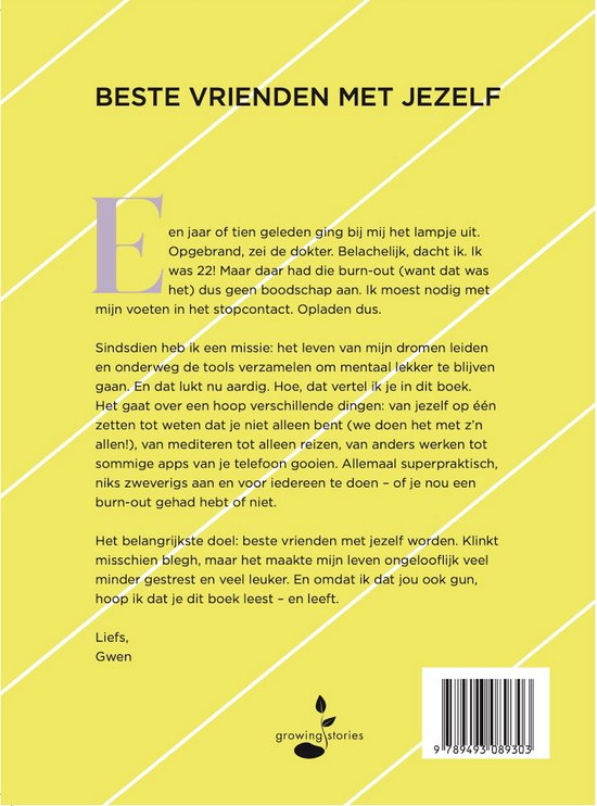 Dit boek gaat over burnout en hoe je kunt opladen. Ieder hoofdstuk begint met een persoonlijk verhaal over haar eigen burnout. Hierdoor voel je meteen een connectie met Gwen en wordt het onderwerp meteen duidelijk. Ze geeft ook praktische tips en deelt haar ervaringen. In 2018 ben ik dankzij Gwen begonnen met mediteren. Ik deed mee iedere ochtend om 7:00 uur opstaan en met z'n allen mediteren op Instagram. En ik heb daar zo veel aan gehad. Eerlijk gezegd; daarvoor vond ik het maar 'zweverig' en 'niet voor mij'. Vanaf toen ben ik Gwen gaan volgen. Ik heb zelf ook een heftige burnout gehad die me 2 jaar lang heeft uitgeschakeld. Haar boek heeft me in ieder geval geholpen om weer wat routine aan te brengen in m'n leven en uit m'n burnout. Dit boek is voor je als je burnout wilt voorkomen en als je er in zit. Een aanrader dus!