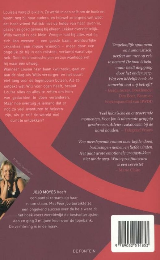Al wat recensies gelezen voordat ik aan het boek begon. In eerste instantie vond ik het een click-it verhaaltje, een romannetje. Er zijn zeker overeenkomsten met The Intouchables maar dat is verder niet storend. Er gebeuren immers dagelijks ongelukken waardoor mensen om ons heen daadwerkelijk in deze situatie terechtkomen! Het einde van het boek nadert nu en ik wil geen afscheid nemen van Lou en Will. De personen leven voor me, het zou mijn eigen verhaal kunnen zijn. Als lezer ga je je indentificeren met Lou en Will. Wat als je zelf in zo'n situatie komt? Wat zal dan je eigen keuze zijn? Ontroerend, meeslepend, tranentrekker. Dit boek leg je zeker niet meer weg! Daarnaast blijft het - in ieder geval bij mij - één van mijn favorieten. Wat een aanrader! Mooi, gevoelig, geweldig! Niet over twijfelen maar aanschaffen en de zakdoeken klaar leggen!