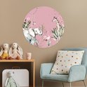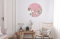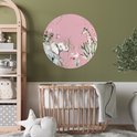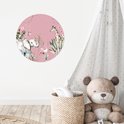 Verrijk de meisjeskamer met een unieke behangcirkel! Op de behangsticker staan wilde dieren omringd door planten op een roze achtergrond.