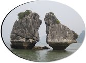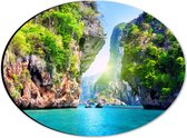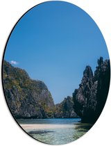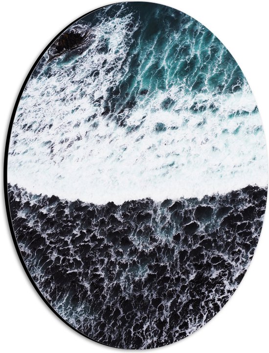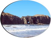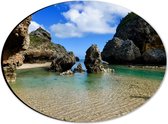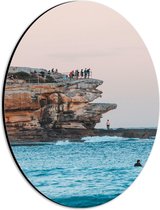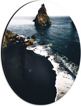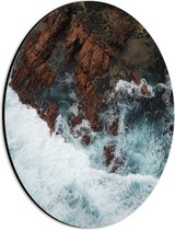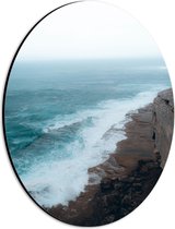 WallClassics - Dibond Ovaal - Bovenaanzicht van Rotsen hangend over Zee - 21x28 cm Foto op Ovaal (Met Ophangsysteem)