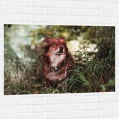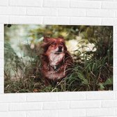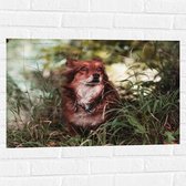 WallClassics - Muursticker - Bruin met Witte Hond in het Gras - 90x60 cm Foto op Muursticker
