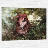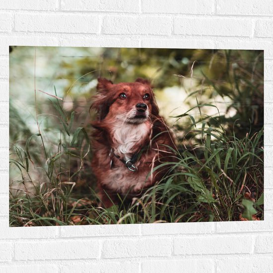WallClassics - Muursticker - Bruin met Witte Hond in het Gras - 105x70 cm Foto op Muursticker