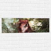 WallClassics - Muursticker - Bruin met Witte Hond in het Gras - 90x30 cm Foto op Muursticker