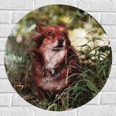 WallClassics - Muursticker Cirkel - Bruin met Witte Hond in het Gras - 60x60 cm Foto op Muursticker