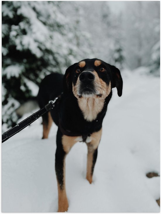 WallClassics - Poster Glanzend – Zwart met Bruine Entlebucher Hond in de Sneeuw - 60x80 cm Foto op Posterpapier met Glanzende Afwerking