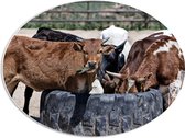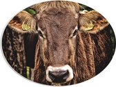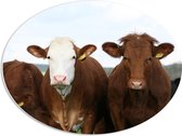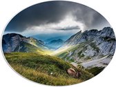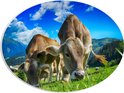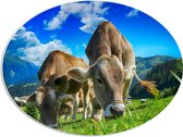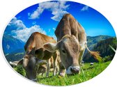 WallClassics - PVC Schuimplaat Ovaal - Braunvieh Koeien tussen Bergen - 56x42 cm Foto op Ovaal (Met Ophangsysteem)