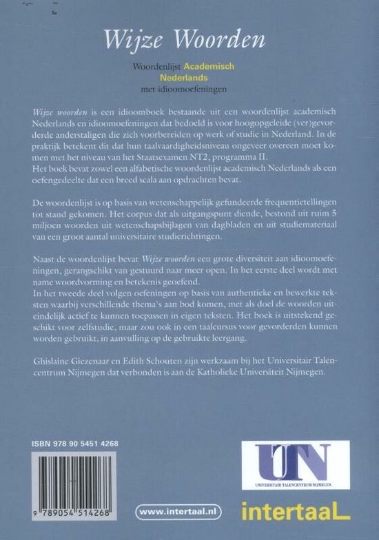 Kenmerken: Wijze woorden is een leeren oefenboek en bevat zowel een alfabetische woordenlijst academisch Nederlands als een uitgebreid oefengedeelte dat een breed scala aan opdrachten bevat. De woordenlijst is op basis van wetenschappelijk gefundeerde frequentietellingen tot stand gekomen. Het corpus dat als uitgangspunt diende, bestond uit ruim 5 miljoen woorden uit wetenschapsbijlagen van dagbladen en uit studiemateriaal van een groot aantal universitaire studierichtingen.Het boek is uitstekend geschikt voor zelfstudie, maar kan ook in de les worden gebruikt, als aanvulling op de gebruikte leergang.