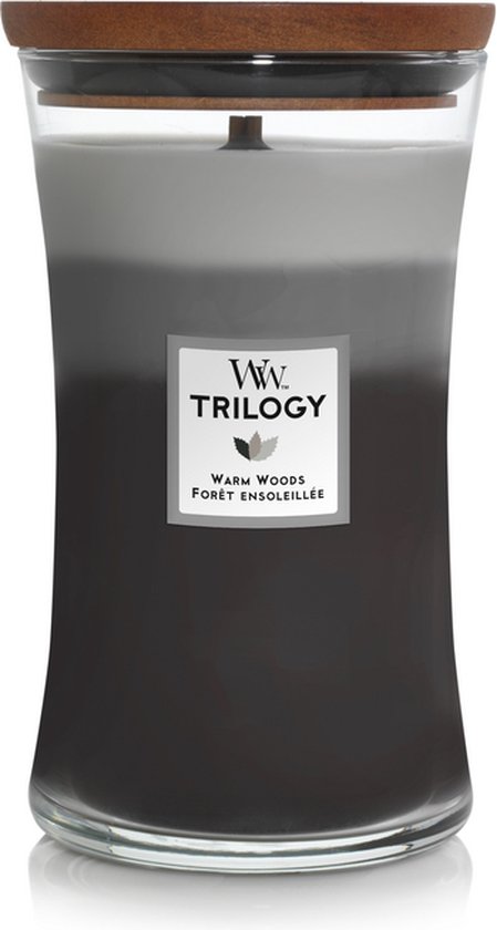 De WoodWick Trilogy Hourglass Large geurkaars - Warm Woods creëert een unieke geurbeleving terwijl de lagen samensmelten.