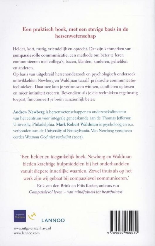 Een praktisch boek, met een stevige basis in de hersenwetenschap Helder, kort, rustig, vriendelijk en oprecht. Dat zijn kenmerken van compassievolle communicatie, een methode om beter te leren communiceren met collega's, bazen, klanten, kinderen, geliefden en anderen. Op basis van uitgebreid hersenonderzoek en psychologisch onderzoek ontwikkelden Newberg en Waldman twaalf praktische communicatietechnieken. Daarmee kun je vertrouwen winnen, conflicten oplossen en meer intimiteit creëren. Bovendien: als je die technieken regelmatig toepast, functioneert je brein aanzienlijk beter.