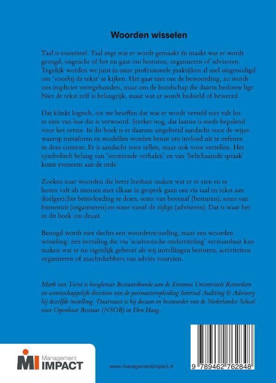 Taal is essentieel. Taal zegt wat er wordt gemaakt én maakt wat er wordt gezegd, ongeacht of het nu gaat om besturen, organiseren of adviseren. Tegelijk worden we juist in onze professionele praktijken al snel uitgenodigd om ‘voorbij de tekst’ te kijken. Het gaat niet om de bewoording, zo wordt ons impliciet voorgehouden, maar om de boodschap die daarin besloten ligt. Niet de tekst zelf is belangrijk, maar wat er wordt bedoeld of beweerd. Dat klinkt logisch, tot we beseffen dat wat er wordt verteld niet valt los te zien van hoe dat is verwoord. Sterker nog, dat laatste is mede bepalend voor het eerste. In dit boek is er daarom uitgebreid aandacht voor de wijze waarop metaforen en modellen worden benut om invloed uit te oefenen in deze context. Er is aandacht voor tellen, maar ook voor vertellen. Het symbolisch belang van ‘versteende verhalen’ en van ‘belichaamde spraak’ komt eveneens aan de orde. Zoeken naar woorden die beter leesbaar maken wat er te zien en te horen valt als mensen met elkaar in gesprek gaan om via taal en tekst aan doelgerichte beïnvloeding te doen, soms van bovenaf (besturen), soms van binnenuit (organiseren) en soms vanaf de zijlijn (adviseren). Dat is waar het in dit boek om draait. Beoogd wordt niet slechts een woordenwisseling, maar een woorden wisseling: een hertaling die via ‘academische ondertiteling’ verstaanbaar kan maken wat er nu eigenlijk gebeurt als wij instellingen besturen, activiteiten organiseren of machtshebbers van advies voorzien. Mark van Twist is hoogleraar Bestuurskunde aan de Erasmus Universiteit Rotterdam en wetenschappelijk directeur van de postmasteropleiding Internal Auditing & Advisory bij dezelfde instelling. Daarnaast is hij decaan en bestuurder van de Nederlandse School voor Openbaar Bestuur (NSOB) in Den Haag. Hij doet niet alleen onderzoek naar besturen, organiseren en adviseren, maar heeft daar in de praktijk zelf ook veel ervaring mee, onder meer als lid in buitengewone dienst van het College van de Algemene Rekenkamer en als voorzitter of lid van diverse raden van toezicht en adviescommissies.