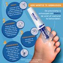 Voor de behandeling: Laat de voet eerst 5 minuten weken in warm water en verwijder daarna de eeltige/harde huid met een vijl. Droog grondig af voordat u de behandeling verderzet. Vijl niet inbegrepen.