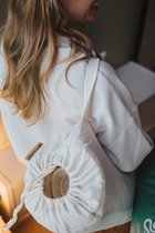 Met extra grote draagtas voor de dikke wollen yogamat. De draagtas is van 100% katoen, heeft een aanpasbare draagriem en opbergvak voor bijvoorbeeld een telefoon of sleutels. De tas heeft een diameter van 25cm, aubergine kleur en een mandala afbeelding.