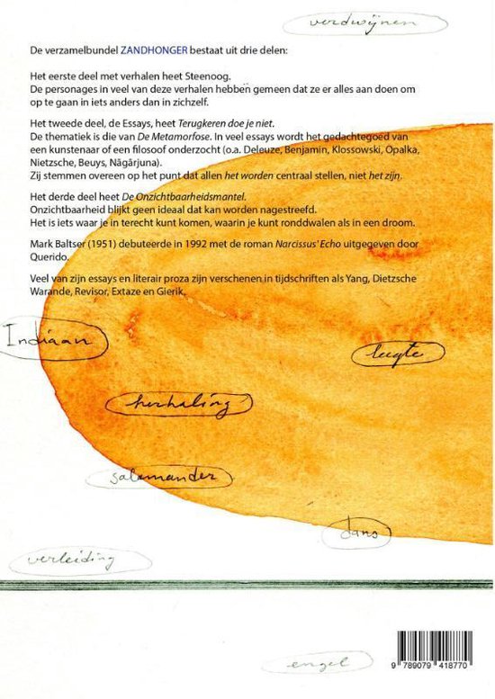 Het boek ZANDHONGER bestaat uit drie delen: Verhalen, Essays en Gedichten.