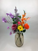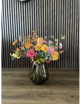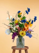 Onze bloemisten hebben het boeket zorgvuldig gestyled en dankzij de buig- en knipbare stelen bepaal je zelf de lengte: van compact voor een salontafel tot hoog en vol in een grote vaas. Perfect in een vaas van ±30 cm hoog met een opening van 6–8 cm; voor een luchtiger veldboeket-effect kies je een bredere vaasopening.