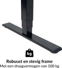 Dit bureau kan tot wel 100 kg dragen en is daarom de perfecte stabiele basis voor je kantoor. Daarnaast heeft het bureau een optimale verstelsnelheid van 35mm/s, waardoor je bureau binnen enkele seconden naar de gewenste hoogte is versteld. Het sterke frame van het bureau zorgt voor stevigheid en elegantie dankzij de strakke zwarte uitvoering. Combineer het zwarte frame met één van de zeven bladen en ga voor een tijdloos bureau dat kwaliteit uitstraalt. Bovendien is het bureau dankzij de bediening met memory functie ideaal om te gebruiken bij flexplekken zodat iedereen zijn eigen zit- en stahoogte (van 65 tot 130cm) eenvoudig kan vastleggen. Hierdoor kies je er sneller voor om met slechts één druk op de knop staand te gaan werken, waardoor (rug)klachten worden voorkomen. Verschillende werkhoudingen zorgt namelijk voor een betere doorbloeding.