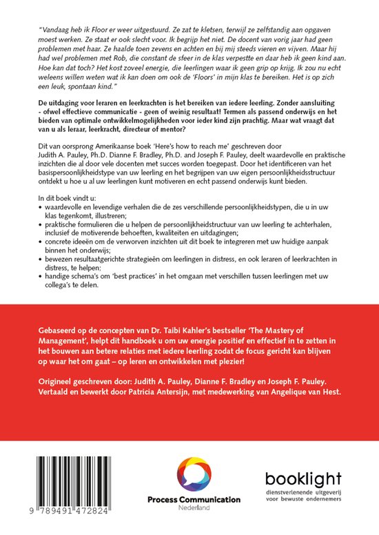 “Vandaag heb ik Floor er weer uitgestuurd. Ze zat te kletsen, terwijl ze zelfstandig aan opgaven moest werken. Ze staat er ook slecht voor. Ik begrijp het niet. De docent van vorig jaar had geen problemen met haar. Ze haalde toen zevens en achten en bij mij steeds vieren en vijven. Maar hij had wel problemen met Rob, die constant de sfeer in de klas verpestte en daar heb ik geen kind aan. Hoe kan dat toch? Het kost zoveel energie, die leerlingen waar ik geen grip op krijg. Ik zou nu echt weleens willen weten wat ik kan doen om ook de ‘Floors’ in mijn klas te bereiken. Het is op zich een leuk, spontaan kind.” De uitdaging voor leraren en leerkrachten is het bereiken van iedere leerling. Zonder aansluiting - ofwel effectieve communicatie - geen of weinig resultaat! Termen als passend onderwijs en het bieden van optimale ontwikkelmogelijkheden voor ieder kind zijn prachtig. Maar wat vraagt dat van u als leraar, leerkracht, directeur of mentor? Dit van oorsprong Amerikaanse boek ‘Here’s how to reach me’ geschreven door Judith A. Pauley, Ph.D. Dianne F. Bradley, Ph.D. and Joseph F. Pauley, deelt waardevolle en praktische inzichten die al door vele docenten met succes worden toegepast. Door het identificeren van het basispersoonlijkheidstype van uw leerling en het begrijpen van uw eigen persoonlijkheidsstructuur ontdekt u hoe u al uw leerlingen kunt motiveren en echt passend onderwijs kunt bieden. In dit boek vindt u: • waardevolle en levendige verhalen die de zes verschillende persoonlijkheidstypen, die u in uw klas tegenkomt, illustreren; • praktische formulieren die u helpen de persoonlijkheidstructuur van uw leerling te achterhalen, inclusief de motiverende behoeften, kwaliteiten en uitdagingen; • concrete ideeën om de verworven inzichten uit dit boek te integreren met uw huidige aanpak binnen het onderwijs; • bewezen resultaatgerichte strategieën om leerlingen in distress, en ook leraren of leerkrachten in distress, te helpen; • handige schema’s om ‘best practices’ in het omgaan met verschillen tussen leerlingen met uw collega’s te delen. Gebaseerd op de concepten van Dr. Taibi Kahler’s bestseller ‘The Mastery of Management’, helpt dit handboek u om uw energie positief en effectief in te zetten in het bouwen aan betere relaties met iedere leerling zodat de focus gericht kan blijven op waar het om gaat – op leren en ontwikkelen met plezier! Origineel geschreven door: Judith A. Pauley, Dianne F. Bradley en Joseph F. Pauley. Vertaald en bewerkt door Patricia Antersijn, met medewerking van Angelique van Hest.