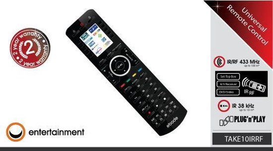 10 in 1 inleer afstandsbediening in nieuw design. De TAKE10 kan tot 10 Audio/Video apparaten bedienen (waaronder TV, DVD speler en ebode en X10 compatibele producten). Heldere TV-kanaal pictogrammen worden weergegeven op het LCD kleurenscherm. Een unieke afstandsbediening voor een unieke prijs.