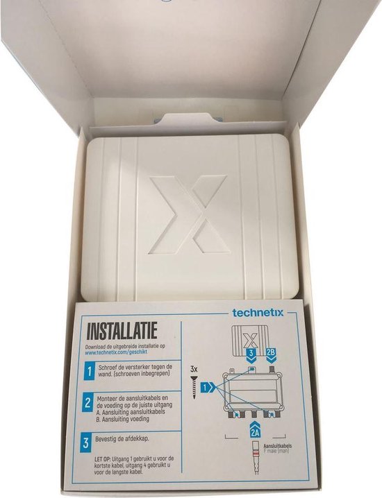 Makkelijk te installeren met drie meegeleverde schroefjes. Jammer dat stroomaansluiting aan de overzijde van de coax aansluitingen zit want daardoor kan je minder makkelijk een plek vinden. Gelukkig is de versterker niet zo klein.